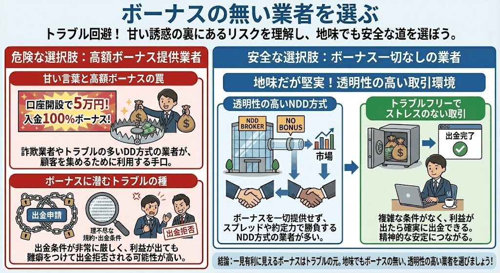 ボーナスが一切ない業者を選ぶのが無難です。
