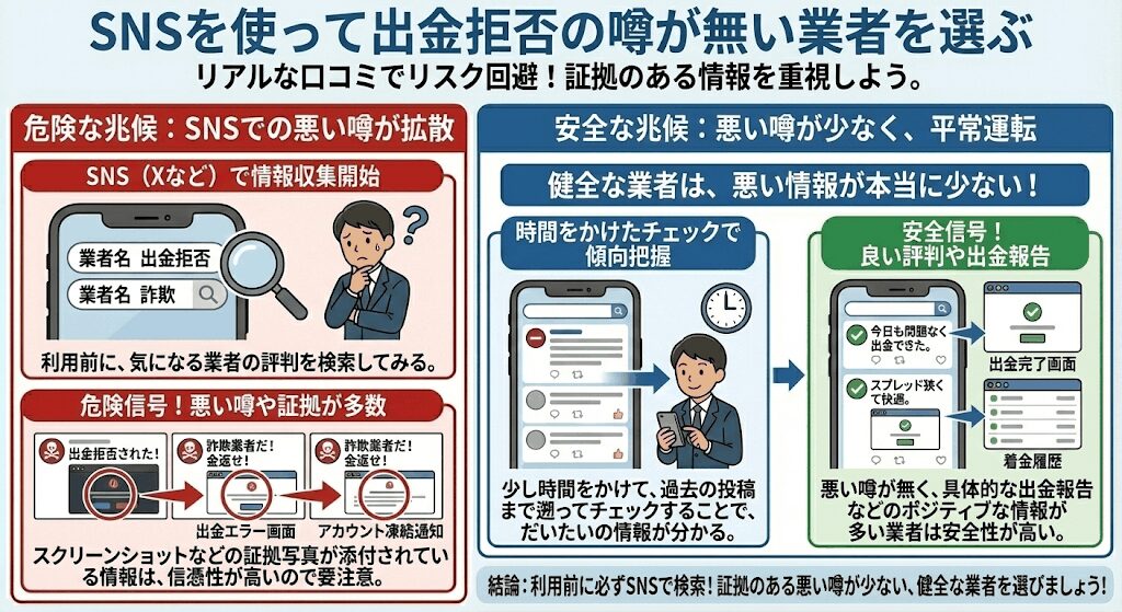 出金拒否や詐欺の情報はSNS(特にX)で情報が拡散されることが多いので、その業者を利用する前に、SNSを使って出金拒否や詐欺が無いか、情報をチェックしてから利用するようにしましょう。