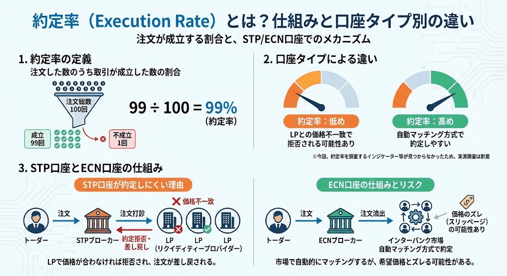 約定率はSTP口座の方が低く、ECN口座は自動マッチング方式なので約定率は高くなります。