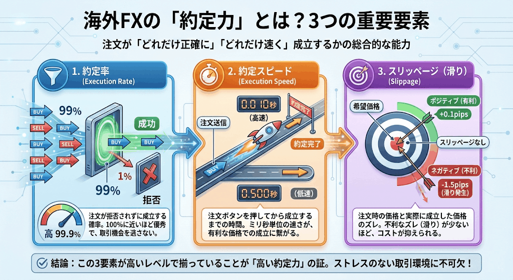 海外FXの約定力とは、総合的に約定する力が強いことを言い、狙った通りの価格で取引を成立させる力です。