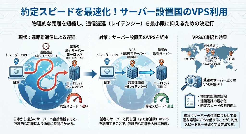 約定スピードを一番速くする方法は、サーバーを設置している国のVPSに切り替えることです。