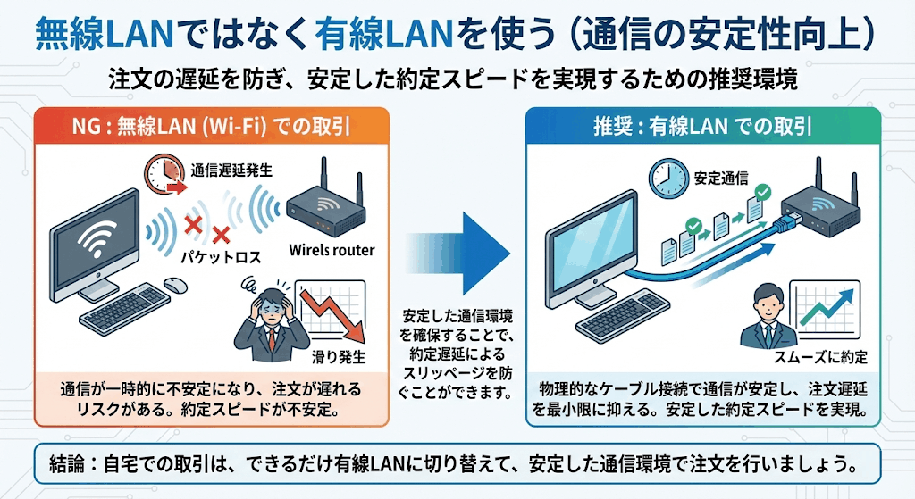 自宅のパソコンで取引をしている場合、無線LANだと通信が一時的に遅れる場合があります。