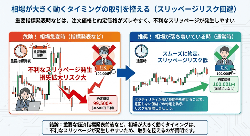 不利なスリッページが発生しやすいタイミングとなるので、気を付けましょう。