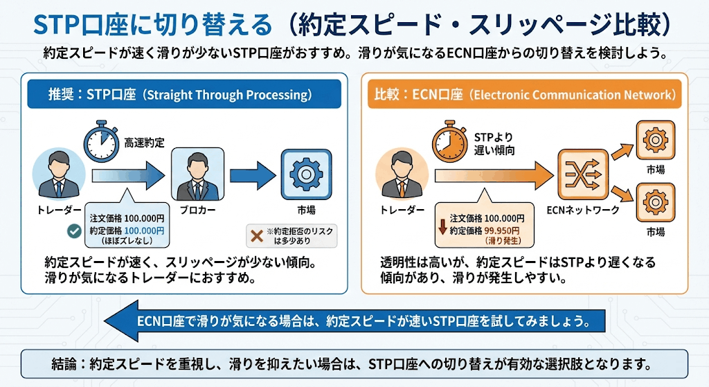 もしECN口座を使っていて、滑りが気になる場合はSTP口座で試してみると良いでしょう。
